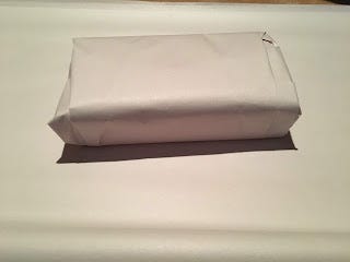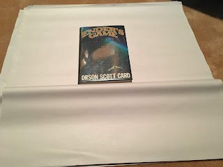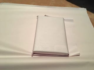 With the foam in, we're ready to wrap books. I ended up using paper, which is cheap and doesn't interact with the covers of the books. These rolls here have sheets that are 2 feet x 2 feet, and there's seventy in each roll. One sheet is enough for one book. You begin like this:
