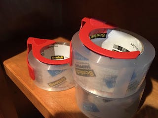 OK, so let's first make the boxes. I assume you know how to tape up a standard box. I double tape the bottom (and later the top), and also tape the sides of the box. I used the tape below, after I tried many different types that all were awful. It's not too flimsy, and the cutter actually works.